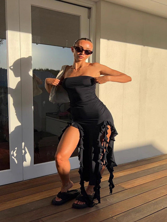 Unleash your confidence with the Midnight Allure Dress, designed to make an unforgettable impression. Its sleek strapless silhouette hugs your curves, while the daring thigh-high slits with cascading details add just the right touch of drama. Whether for a sunset soirée, a night out, or an elegant getaway, this statement piece ensures all eyes are on you.